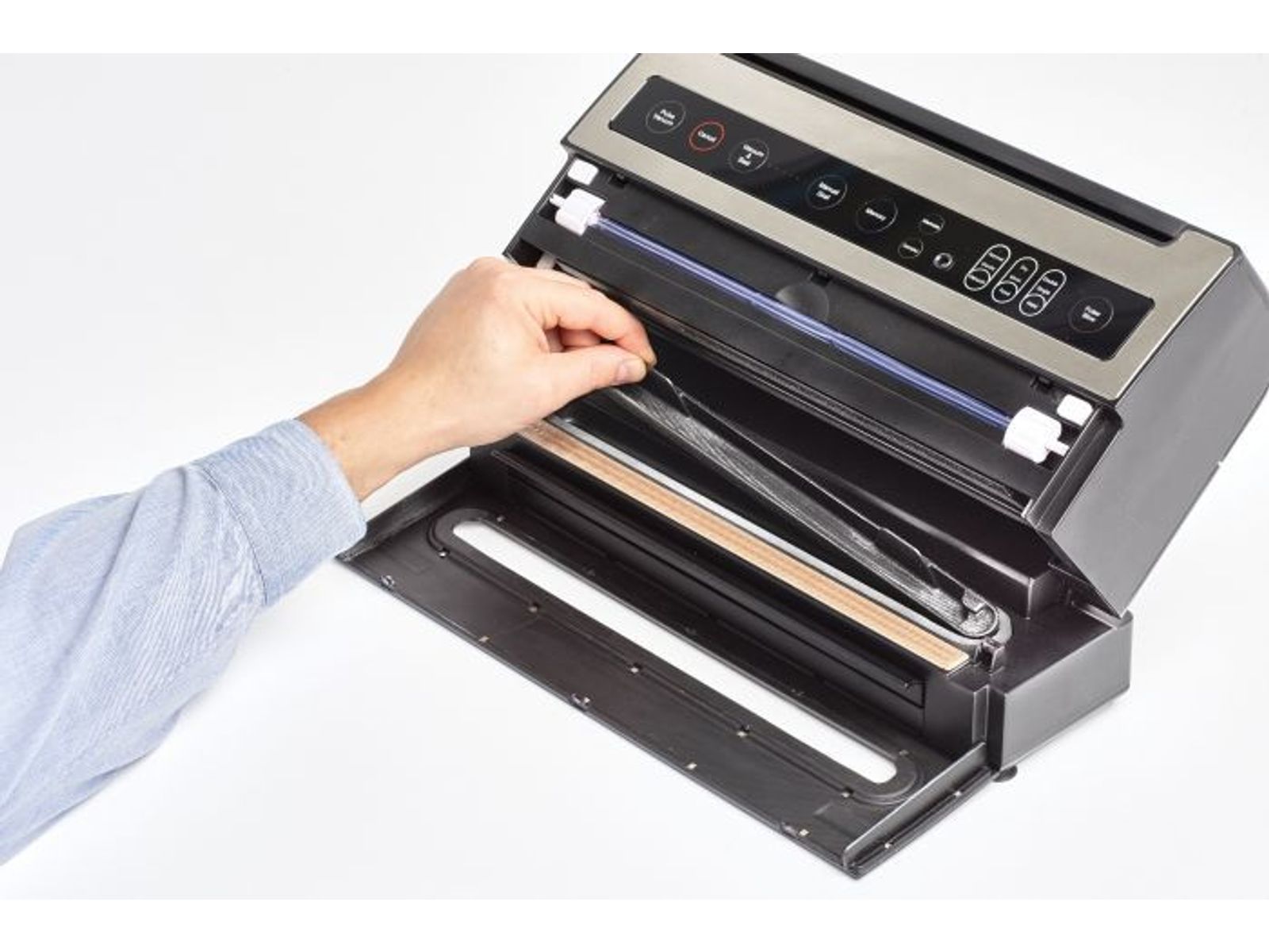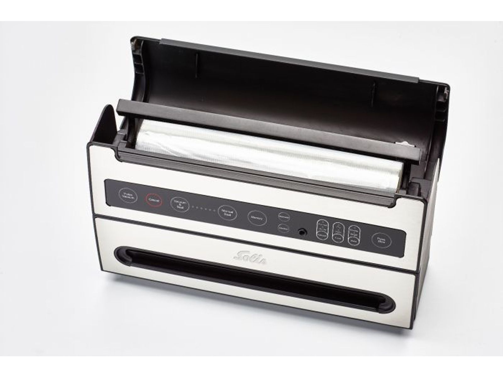 Deze machine beschikt over een handig opbergvak voor rollen folie en een foliesnijder
