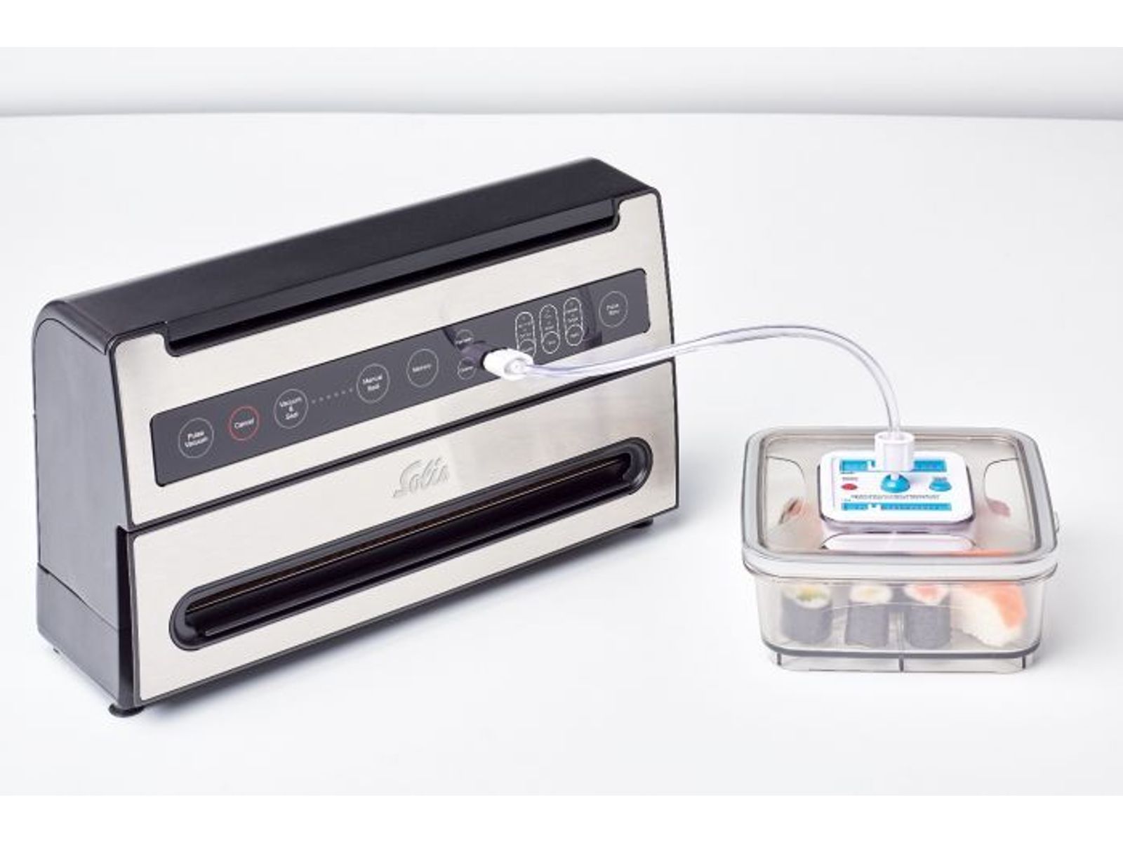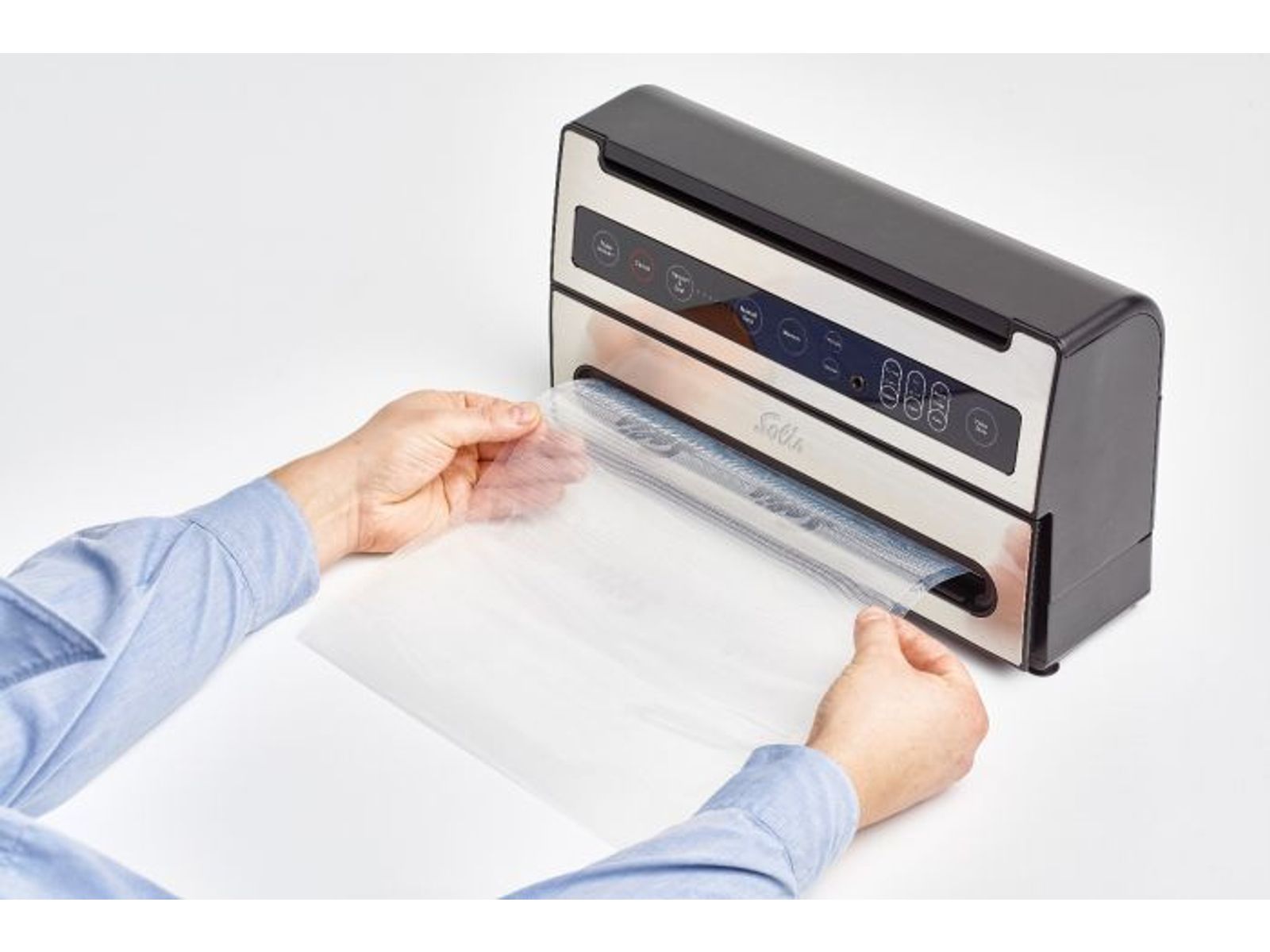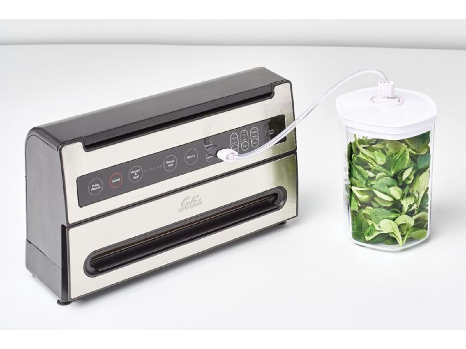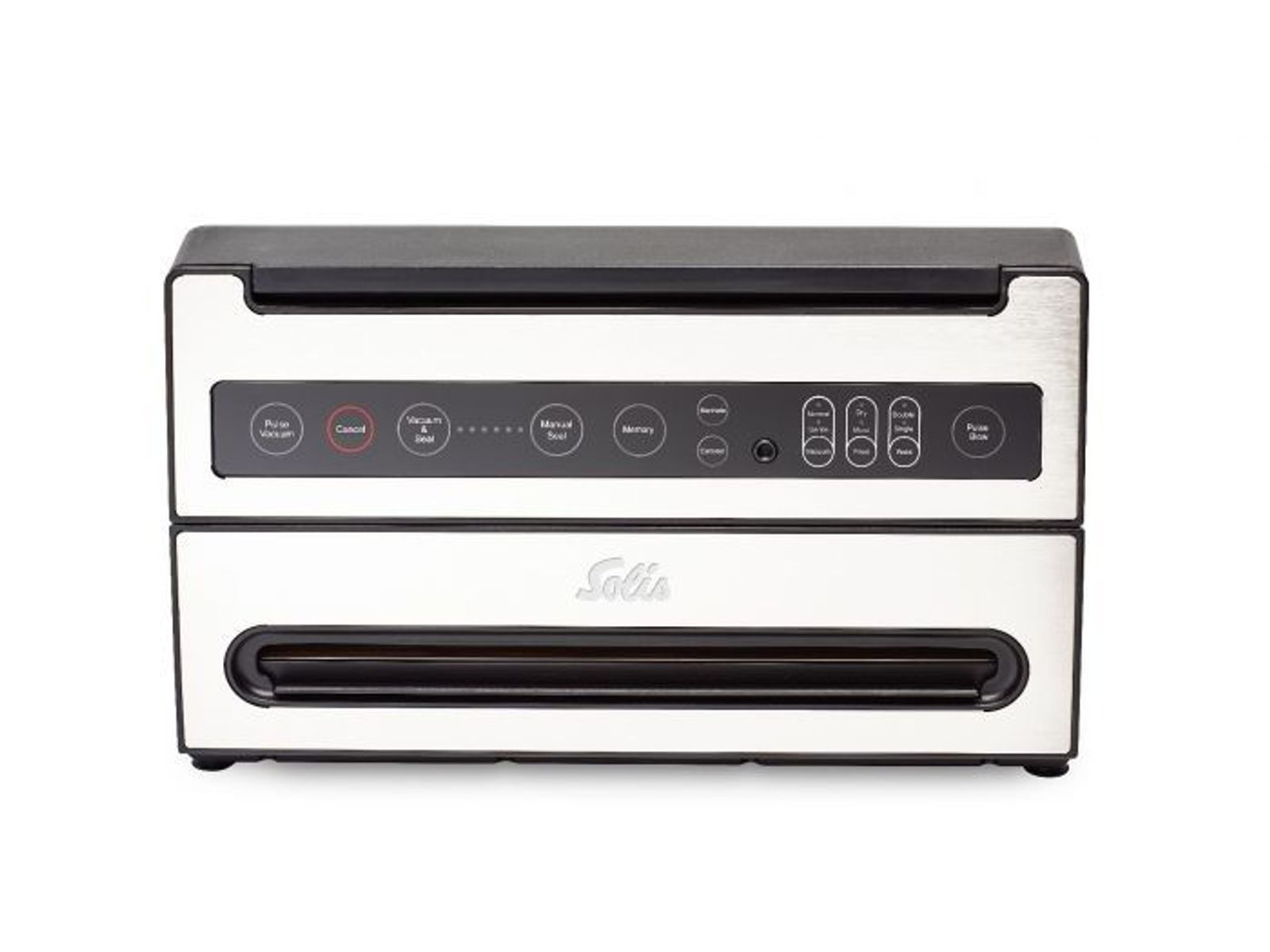 De Solis Verti Vac Plus heeft een behuizing van hoogwaardig edelstaal dat het apparaat een luxe uitstraling geeft. Het vacuümsysteem kan zakken en folie van maximaal 30 cm breed verwerken. Na het vacumeren kiest u of de zakken met een dubbele of enkele sealnaad afgesloten moeten worden. Zowel de vacumeer- als sealtijd zijn eenvoudig in te stellen op het bedieningspaneel.