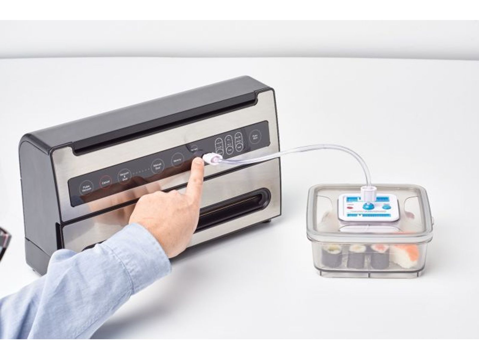 De machine is geschikt voor zowel vochtige als droge voedingsmiddelen en heeft een Instant Seal functie voor delicate en drukgevoelige levensmiddelen. Uniek aan dit vacuümsysteem is de geheugenfunctie en de Pulse Blow functie voor het volblazen van zakken met lucht ter bescherming van drukgevoelige producten.