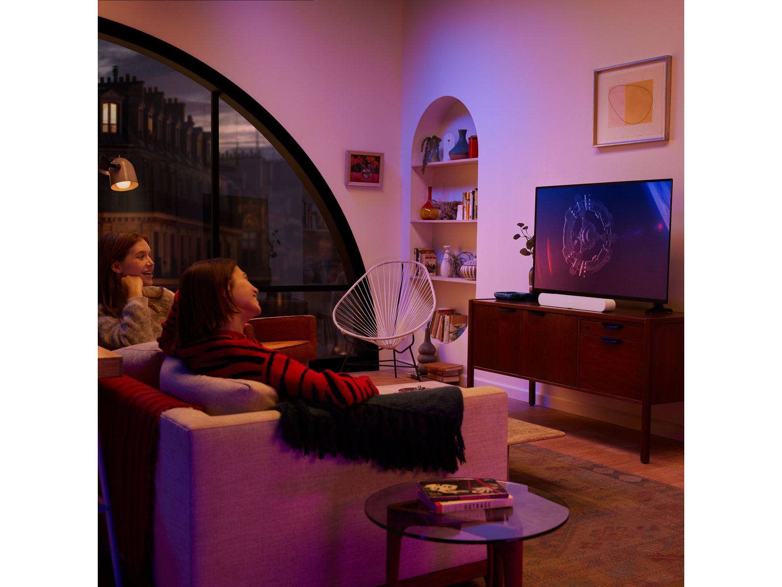 Als de tv is uitgeschakeld kun je muziek, radio, podcasts en luisterboeken vanaf al je diensten afspelen via wifi met de Sonos-app, Apple AirPlay 2 of Spotify Connect.