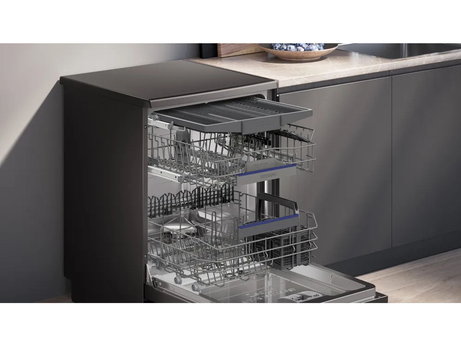 Klaar voor je vaat: de nieuwe flexibele korven en lades zorgen voor extra gemak tijdens het in- en uitruimen van de vaatwasser. Of het nou borden, pannen, kopjes of wijnglazen zijn, in de Siemens vaatwassers met flexibele korven en lades krijgt alles plek.
